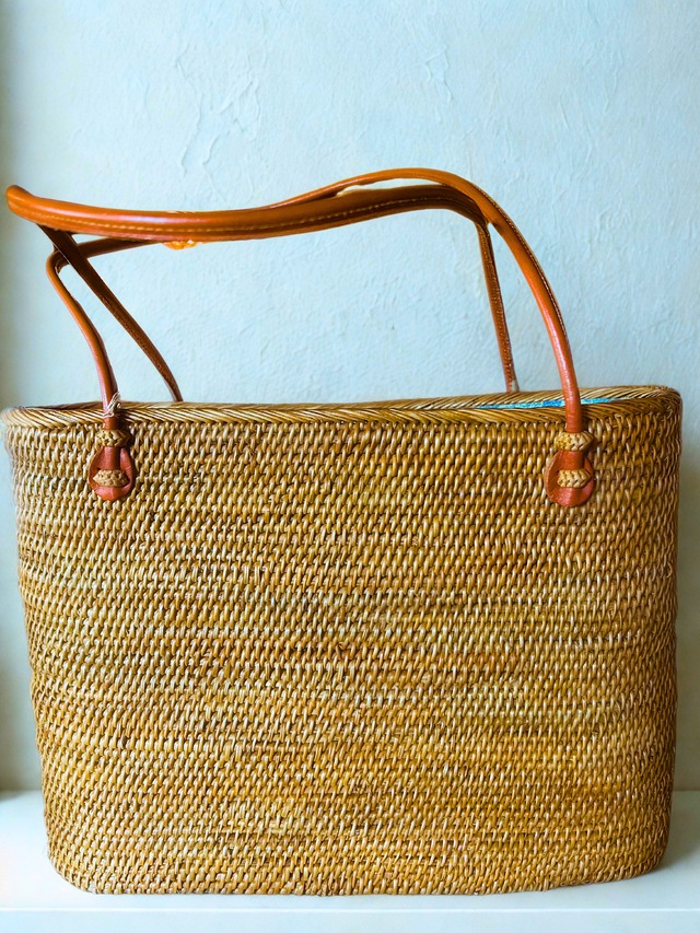 アタかごバッグ – バリ島の職人が紡ぐナチュラルな美しさ 南国バリ島の陽射しの下、ひとつひとつ丁寧に編み上げられたアタかごバッグ。伝統工芸の技が息づくこのバッグは、シンプルでありながら存在感のある逸品です。 軽やかで丈夫なアタ素材は、使うほどに艶が増し、あなただけの風合いに育っていきます。 ナチュラルな編み目の美しさは、浴衣や夏の装いはもちろん、リゾートや街歩きにもぴったり。どんなスタイルにも自然と溶け込み、コーディネートを引き立ててくれます。 内布は華やかなバティック生地(綿100%)。 ⸻ 製作のこだわり このバッグは、職人が一本一本手作業で丁寧に編み上げたあと、数日間の天日干しを経て、 さらにココナッツの木のチップで燻して仕上げられます。ほのかに香るスモーキーな香りは自然の贈りもの。 バリ島の風と太陽、そして自然素材アタとココナッツのぬくもりを感じていただけます。 ⸻ 特徴 素材:天然アタ100% 内布:綿100% ハンドル:革 サイズ:幅29.5cm × 高さ20cm × マチ10cm 原産地:インドネシア・バリ島 職人がひとつずつ時間をかけて編むため、すべて一点もの。ナチュラルな香りと温もりを感じる、世界にひとつだけのハンドメイドバッグです。 おすすめのシーン • 夏のお出かけやリゾート旅行に • 浴衣やワンピースとの相性も抜群 • カジュアルにも上品にも使える万能デザイン • インテリア収納として飾っても素敵 ⸻ お手入れ方法 • 水に濡れた場合は、直射日光を避け、風通しのよい場所で陰干ししてください。 • 汚れは柔らかい布で優しく拭き取ってください。 ⸻ 自然とともに暮らす。 そんな想いを込めて、日常にバリ島の風を運ぶアタバッグ。あなたのワードローブに加えてみませんか?