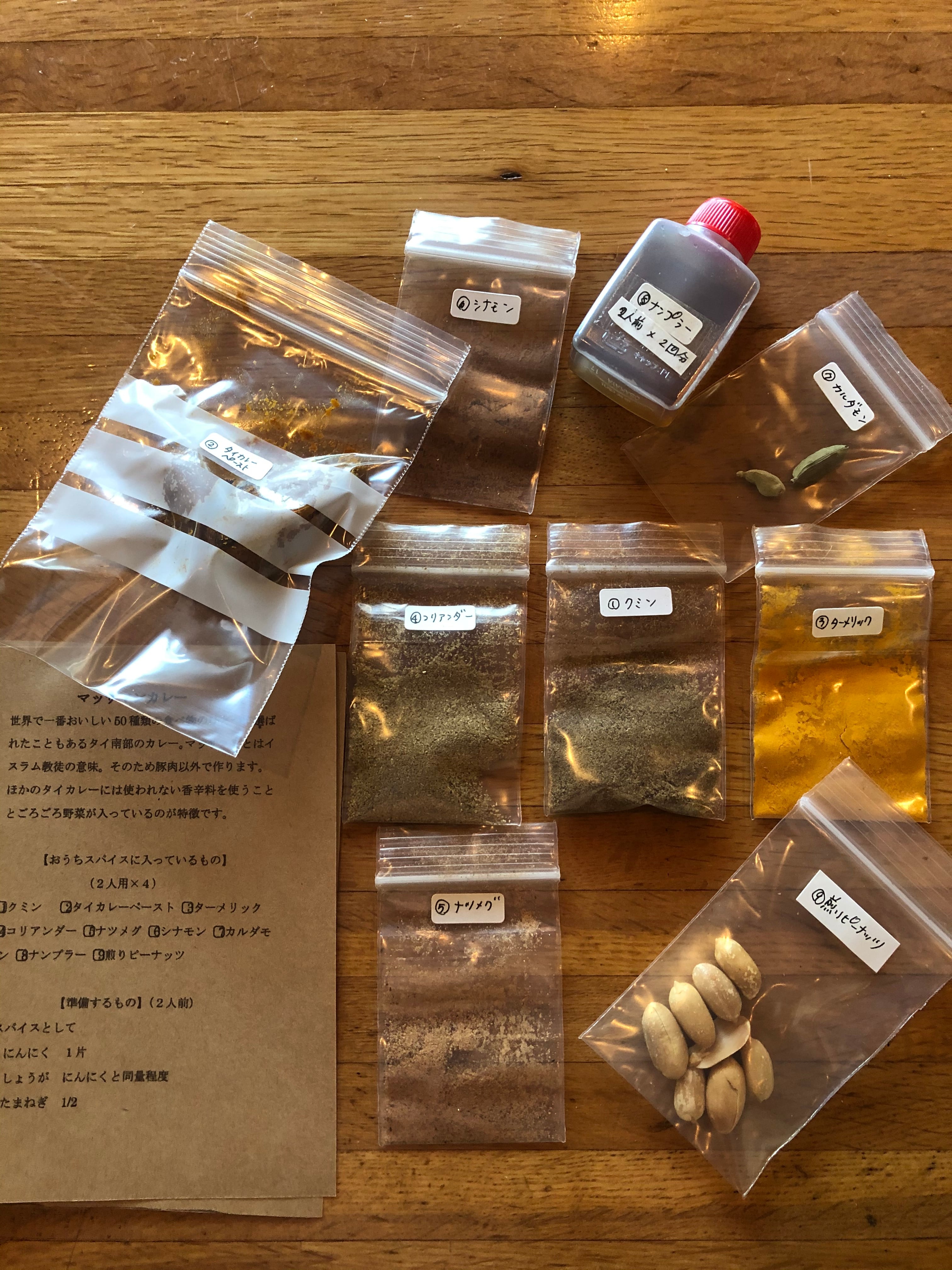 2〜6人前程度(具材と水分量で調整可能)の小分け包装したスパイスと作り方の詳しいレシピが入っています。